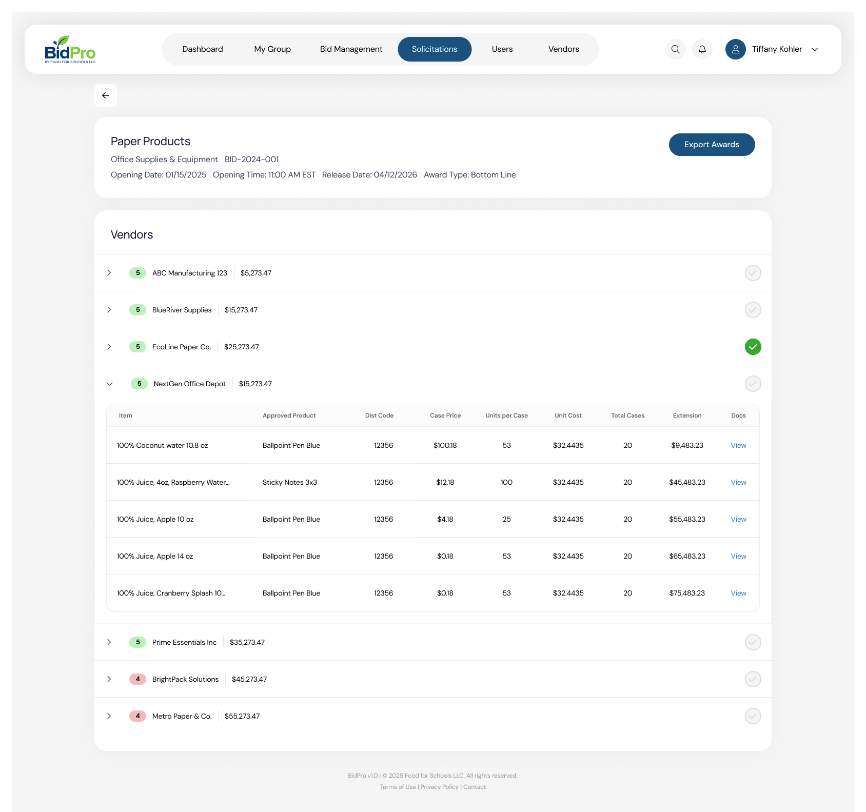 Once they initiate a BidPro Vendor account, vendors are notified of solicitations as soon as they are released. At any time before the Bid Opening date, they can then view the bid, submit pricing, and upload all required documents. BidPro eliminates the need for hard to manage Excel sheets as all of the pricing is entered directly into the system. If the group allows “Equal” items, vendors submit those right in BidPro for approval. BidPro makes it easy for vendors to participate, eliminating hurdles and increasing competition for districts and groups.